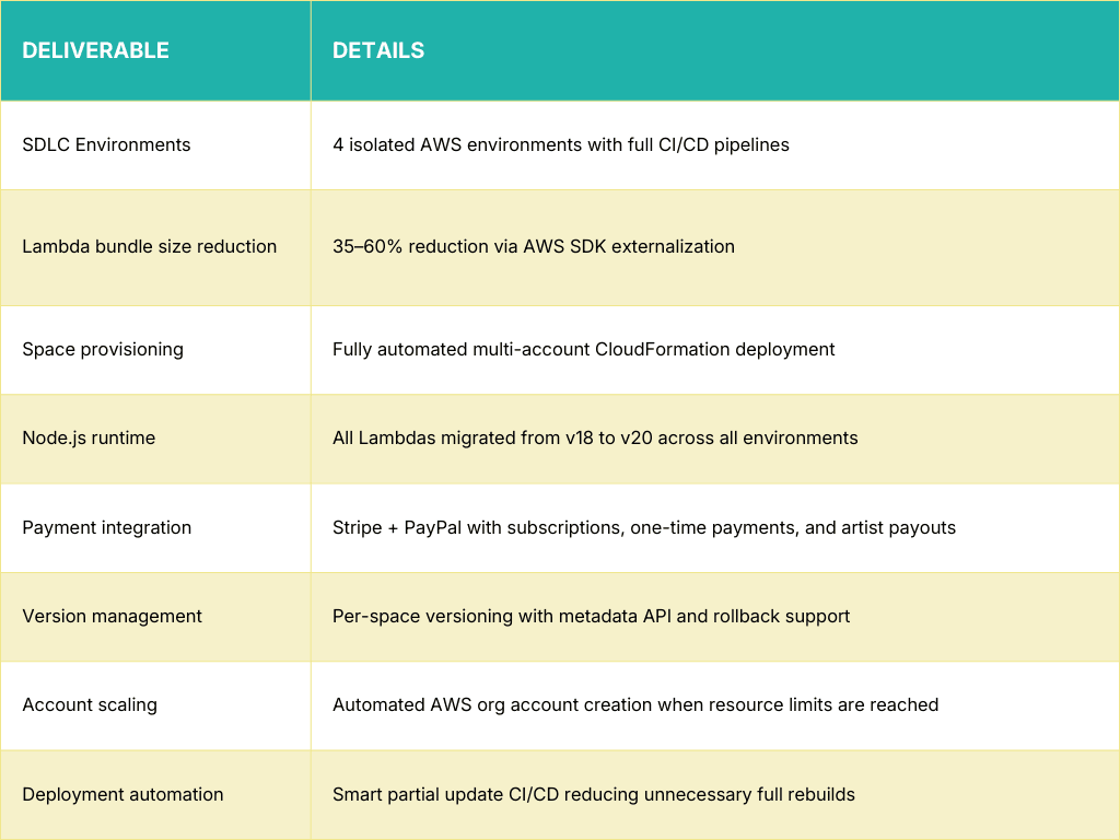 Because each Space runs an independently deployed stack, Ascendro implemented a versioning strategy that allows some artists to remain on stable versions while others adopt new features. This includes Lambda aliases (e.g., beta_v1, beta_v2), API Gateway stage versioning (/v1/, /v2/), versioned React app deployments in S3, and version metadata stored in DynamoDB for each space.